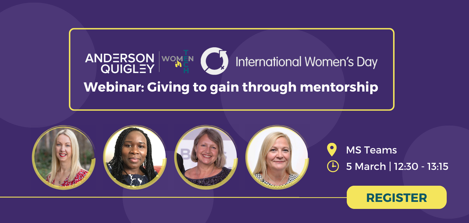 There is real power in mentorship, which is why we are thrilled to be developing our matchmaking mentorship programme – connecting those within our women in tech group, and wider AQ networks, to support each other through informal mentoring. If you’d like to be part of this programme, either as a mentor or mentee, please respond accordingly on the registration form for the webinar and we will be in touch with further information; if you can’t attend the webinar, but would also like to be part of the programme, please complete webinar registration form.
